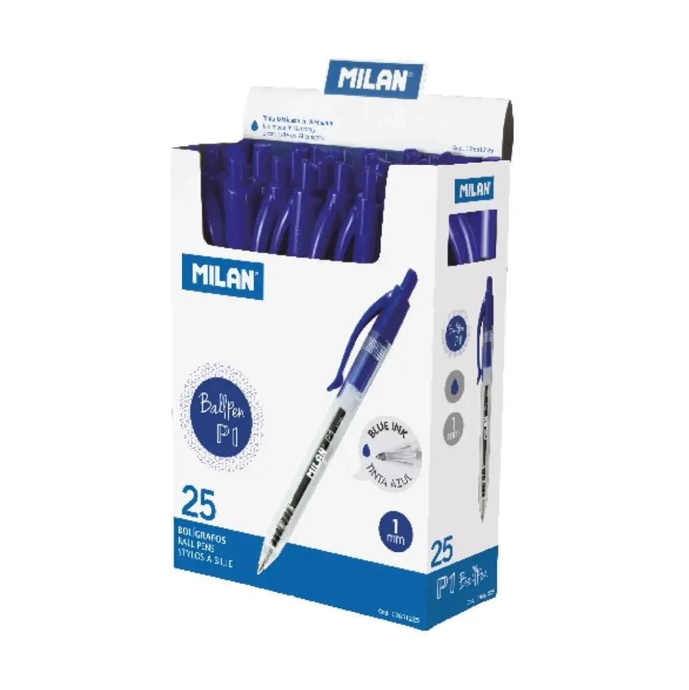 Bolígrafo P1 colores surtidos con cuerpo transparente. Pulsador y pinza del mismo color que la tinta. Longitud de escritura aproximada de 1.200 metros. Punta 1 mm. Tinta fabricada en Alemania. Diseño original creado por el departamento de I+D de MILAN. Medidas bolígrafo: 14,1 x 1,7 cm. 1 cm Ø.