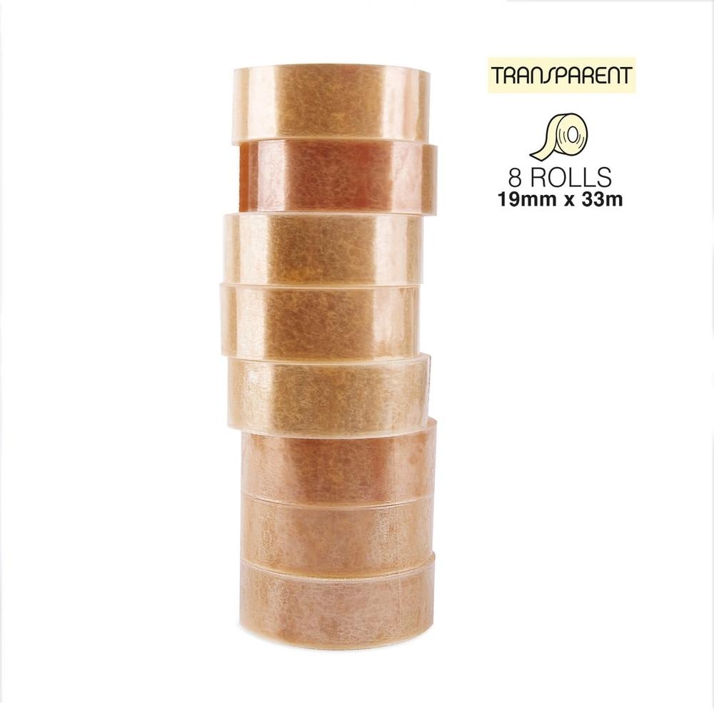 Torre de 8 unidades de cinta adhesiva transparente 19 mm x 33 m de uso universal. Film resistente de 28 micras y desenrollado silencioso. Buena transparencia y fuerte adhesión en cualquier tipo de superficie. Fácil de cortar con las manos.
