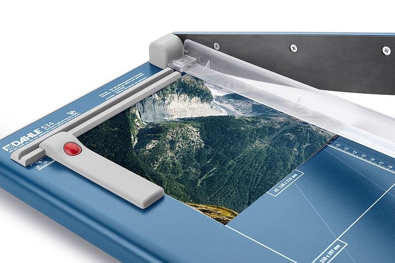 Cizalla de palanca manejable para cortes hasta DIN A4 Dahle 534, cizalla compacta para uso básico y ocio, sólida mesa de metal con esquinas redondeadas y pies de goma antideslizantes para una posición segura, prácticas cavidades, las útiles líneas de formato con divisiones en mm a lo largo del borde de corte de la mesa facilitan la alineación del objeto a cortar, mango ergonómico, dos topes angulares con escala en mm para un corte exacto de 90º, cuchilla superior de acero de Solingen rectificada y endurecida, atornillada al dorso de la cuchilla de acero macizo, cuchilla inferior de acero de Solingen, rectificada y endurecida, cuchilla de acero de alta calidad de Solingen, lomo sólido de la cuchilla completamente de acero para un guiado óptimo de la cuchilla superior atornillada, prensado manual con protección para los dedos integrada para la fijación segura del material, tope posterior regulable para la detección rápida del formato, aplicable en ambos topes angulares.