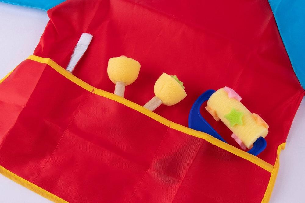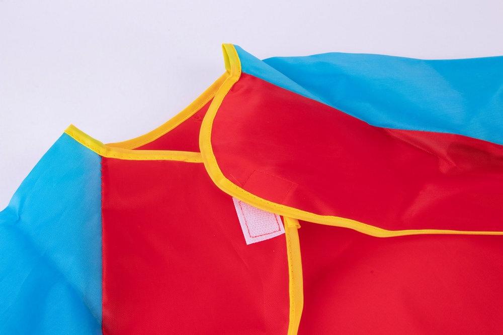 Delantal/bata para pintura talla S, para menores de 3 años, en color rojo y azul, con un bolsillo para guardar los pinceles u otras herramientas y cierre velcro posterior.