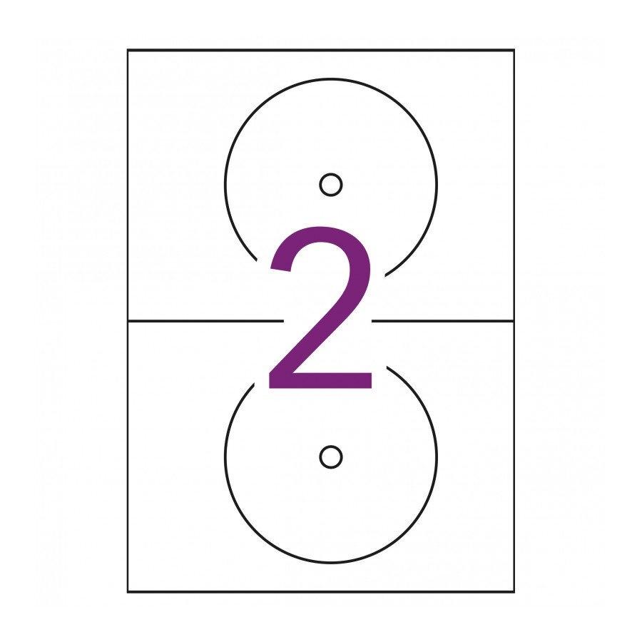 Etiquetas para CD/DVD en tamaño mega (Ext.: Ø 117 mm - Int.: Ø 18 mm) con adhesivo permanente y dorso opaco. El tamaño mega proporciona una cobertura total de la superficie del CD y el dorso opaco evita que transparente cualquier inscripción anterior. Cada pack contiene 25 hojas (50 etiquetas). Personaliza tu CD/DVD. Con estas etiquetas te será muy sencillo crear tus propios diseños y personalizar tu etiqueta dándole un aspecto auténtico y muy profesional. Excelente calidad de impresión en impresoras inkjet, láser y fotocopiadoras.