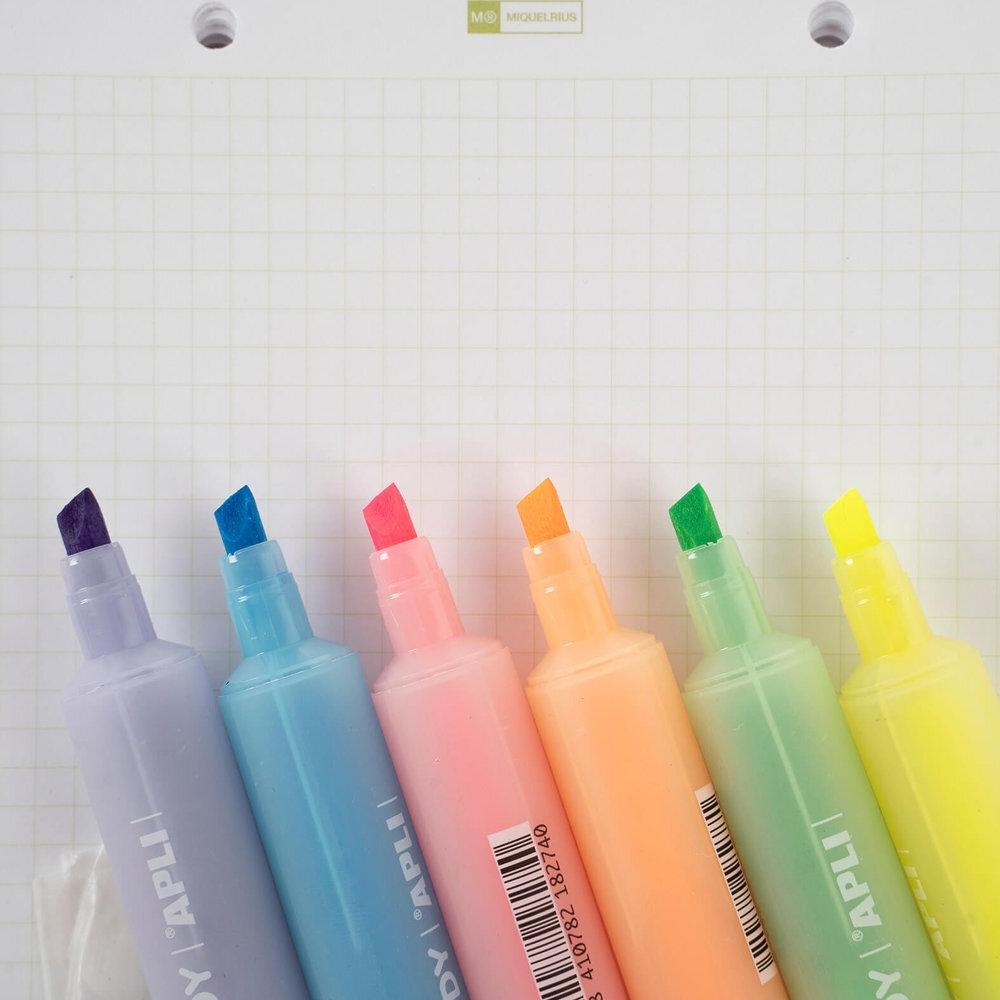 Expositor de subarayadores fluorescentes con forma de caramelo de doble punta: plana de 5 mm y redonda de 2 mm. Disponibles en 6 colores: azul, verde, naranja, amarillo, rosa y morado en tonalidades fluor. Cada expositor contiene 36 marcadores, 6 unidades por color. Ideales mara subrayar, marcar y escribir textos destacados en agendas, libretas y calendarios.