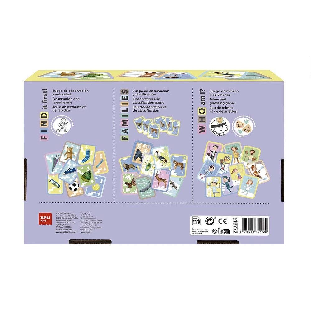 Expositor de 9 unidades con 3 juegos de cartas diferentes: "Families", "Who am I?" y "Find it first". El expositor incluye 3 juegos de cada modelo: Families, juego de observación y clasificación; Who am I?, juego de mímica y adivinanza; Find it first!, juego de observación y velocidad.