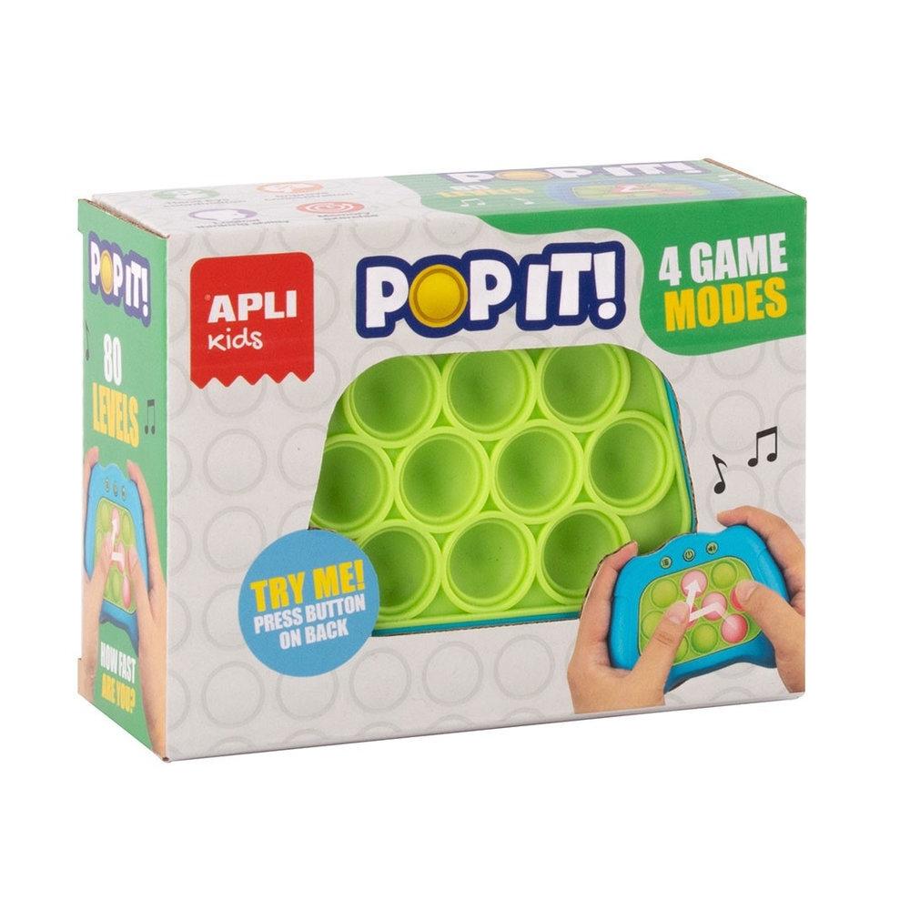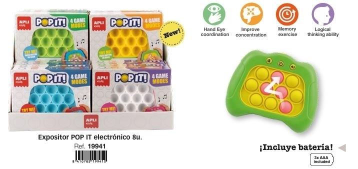APLI 19941 Juego Electrónico POP IT, un divertido reto de agilidad mental, velocidad y atención con 4 modos de juego y 80 niveles. Consiste en presionar rápidamente las burbujas de silicona que se iluminan, aumentando la dificultad a medida que avanzas. Favorece la coordinación mano-ojo, la concentración, la memoria y el razonamiento lógico. Diseño ergonómico apto para todas las edades, ideal para niños y adultos. Incluye instrucciones y batería.