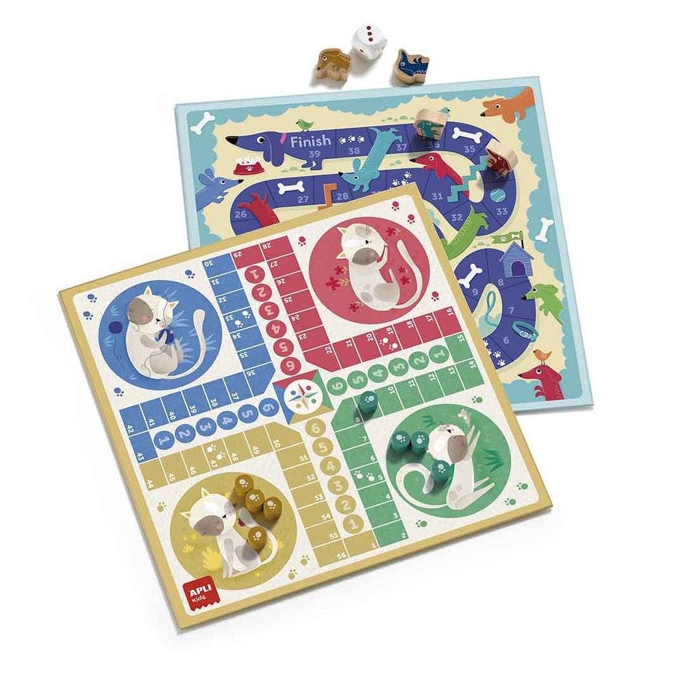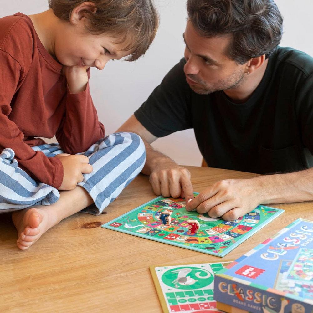 Cuatro juegos clásicos reunidos en uno con adorables ilustraciones: la oca, el parchís, el 4 en raya y el juego de las escaleras. ¡Ideal para las tardes en familia!
