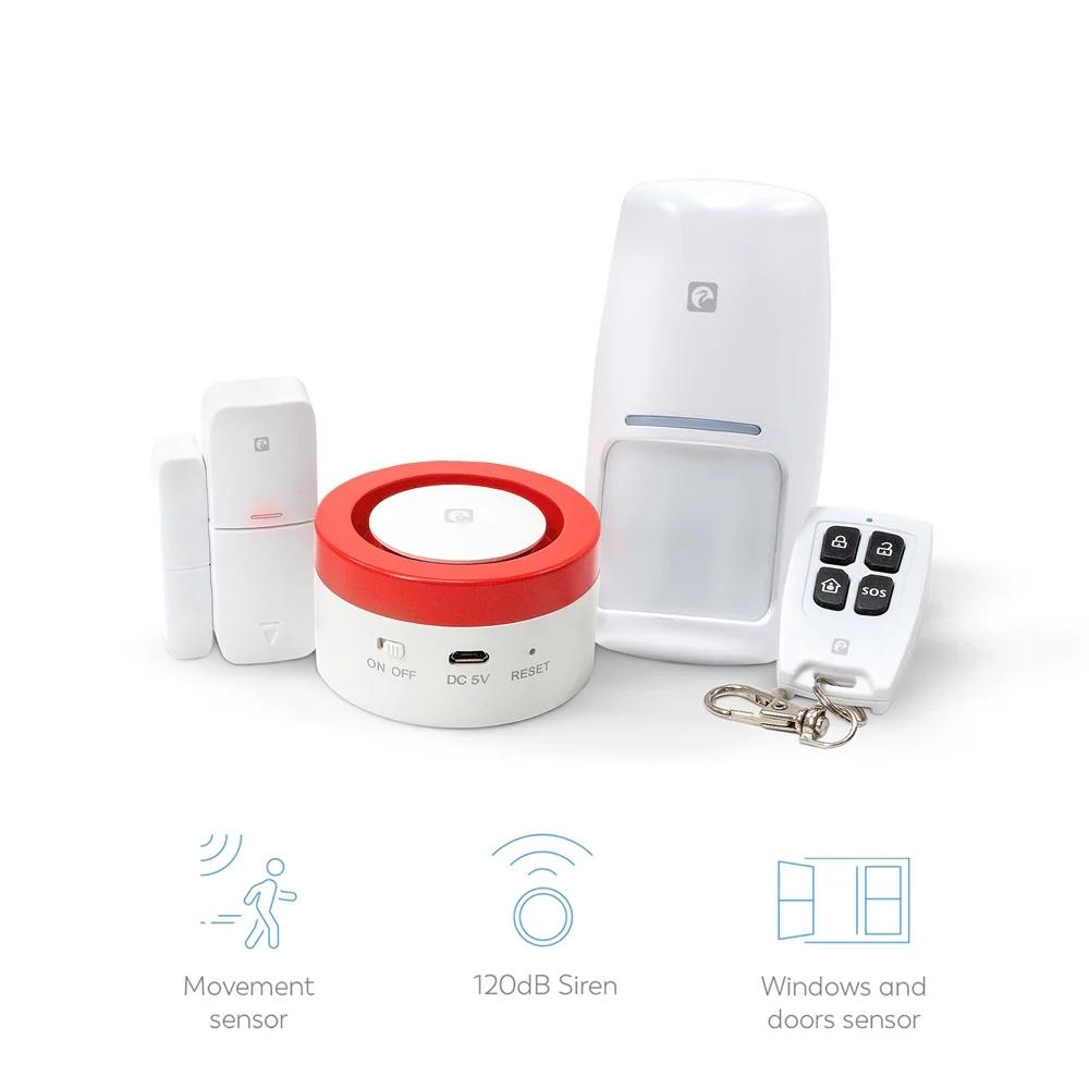 Incluye un sensor de movimiento con ángulo de detección 110º , un sensor de apertura de puertas o ventanas y un mando a distancia para control remoto con opción de armado/desarmado de alarma y función SOS. Pilas incluidas en todos los accesorios.