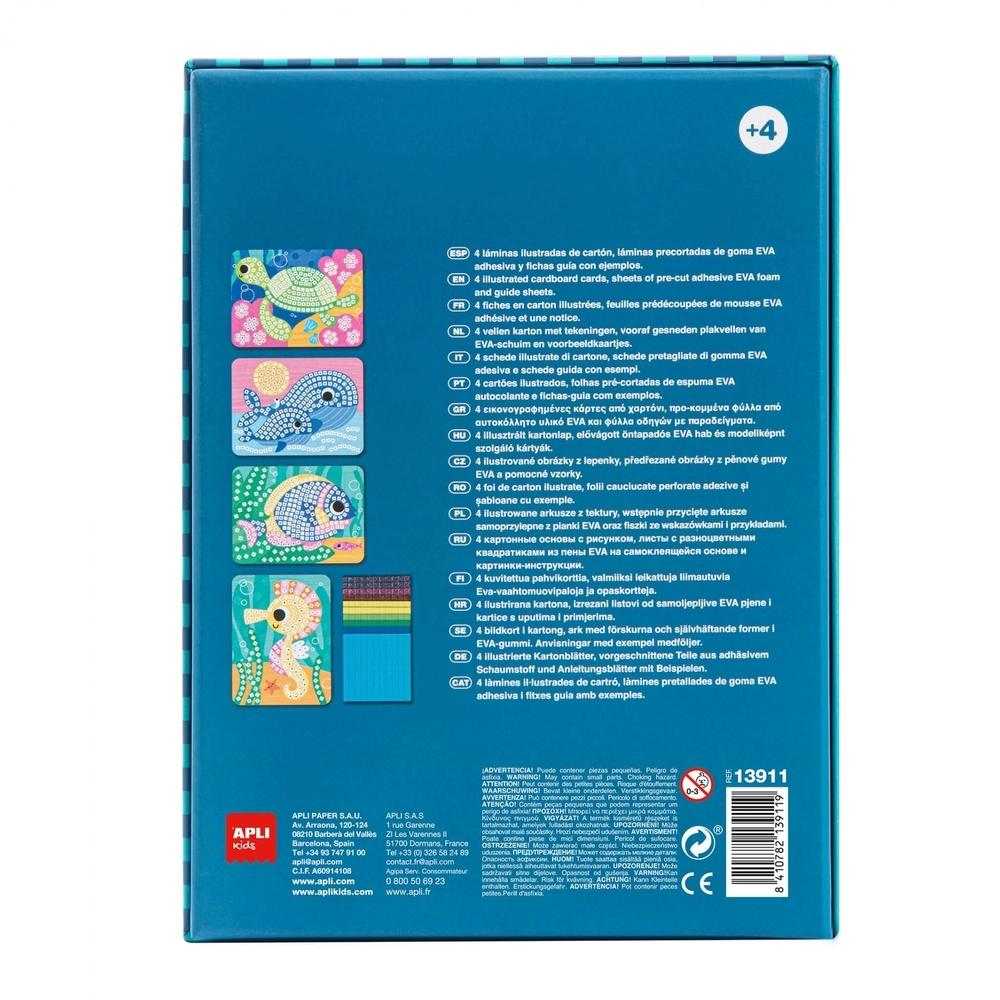 Juego para crear mosaicos con goma EVA adhesiva precortada de diferentes colores y acabados de temática Mundo Marino.