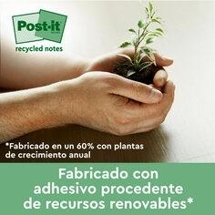 Las notas recicladas Post-it® están fabricadas 100 % con fibras de papel reciclado y un adhesivo de fuentes renovables, fabricado al 60 % con plantas que vuelven a crecer cada año. Tienen la certificación PEFC RECYCLED, se obtienen de bosques certificados, renovables y gestionados responsablemente.