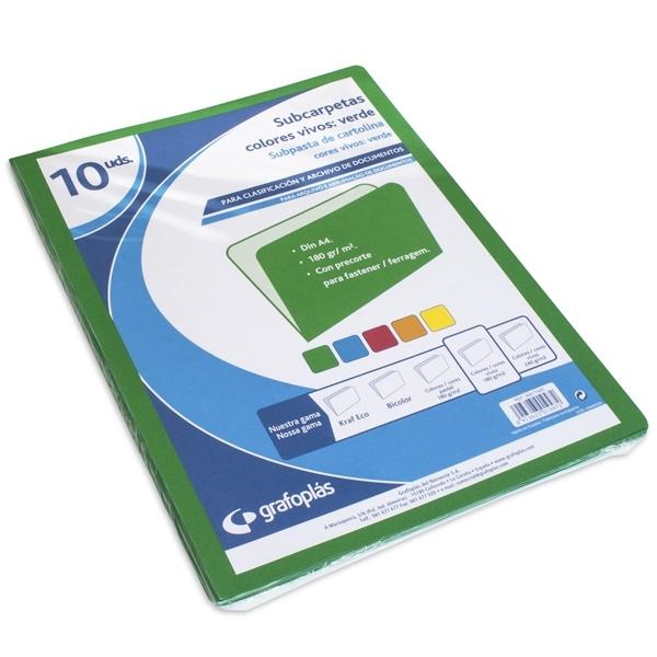 -Subcarpetas en cartulina con cantos redondeados. - Con perforaciones para la incorporación de un fastener. - Con hendido cortesía en el frente. - En formatos: · Folio · DIN-A4 - En gramajes: · 180g/m² - En colores muy vivos: · Verde, Turquesa, Rojo, Naranja, Amarillo y Blanco.