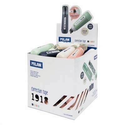 Cinta correctora en seco cilíndrica, serie 1918. Apta para zurdos gracias a la rotación de 360º de su punta. Rápida, limpia y precisa. Correcciones sobre todo tipo de papel, no deja marcas en fotocopias o fax. 5 mm de ancho x 6 m de largo. Colores surtidos: blanco, azul marino, verde y rosa. La serie 1918 está inspirada en los colores y diseño originales de las gomas de borrar MILAN. Recambios de la cinta correctora disponible en formato blíster ref. BWM10467.