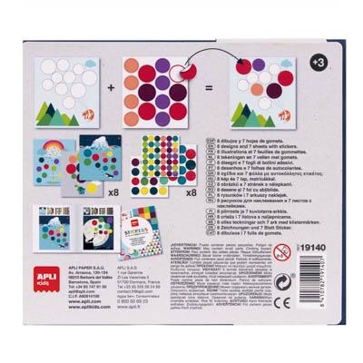 El juego incluye: 8 láminas ilustradas de 200 g con acabado mate para rellenar con gomets, 7 hojas de gomets removibles geométricos en distintos colores y un libro guía con ejemplos en color.