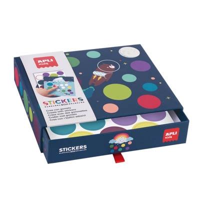 Juego de gomets modelo Viaje a la luna en caja de cartón. El objetivo del juego es completar los dibujos de las fichas usando gomets de distintas formas, colores y estampados.