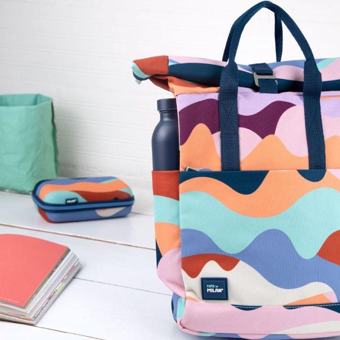 Mochila urbana con cierre superior enrollable que permite ajustar su capacidad al contenido. Serie The Fun, multicolor. Una colección inspirada en la diversión y el disfrute de la experiencia durante el proceso creativo. Con una paleta de colores únicos, las distintas formas de un collage se convierten en el estampado de esta colección. Cierre superior con cremallera y correa con hebilla metálica. Bolsillo frontal con cremallera. 2 bolsillos laterales de fácil acceso. Bolsillo trasero acolchado y con forro de terciopelo, que protege las pantallas y contenido de posibles rasgaduras. Asas regulables que se pueden ajustar y recoger sus correas, convirtiendo la mochila en bolsa de mano.