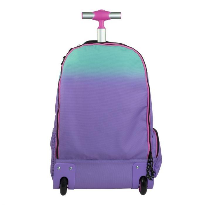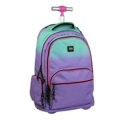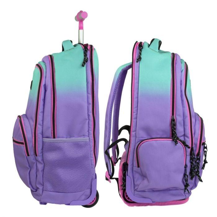 Mochila escolar con sistema de carro ligero integrado y mango metálico retráctil. Serie Sunset, color lila-turquesa. Forro interior de color rosa. Una combinación de colores degradados inspirados en el atardecer, acompañados de estampados geométricos en blanco y negro. Bolsillo principal con compartimento interior protector para portátil. 3 bolsillos delanteros, uno de ellos con organizador y llavero extraíble. 2 bolsillos laterales de fácil acceso (uno de malla y otro con cremallera). Las asas son regulables y se pueden recoger. La cubierta para las ruedas permite para llevar la mochila en la espalda sin mancharse. Base reforzada. El mango de transporte se puede ocultar por completo.