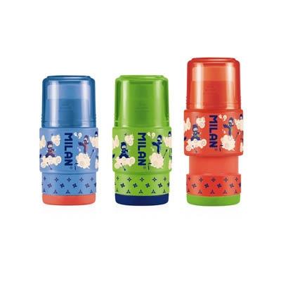 Combinación de goma de borrar y sacapuntas con depósito. Diseño EXTENSION, serie especial Ninjutsu. Goma suave de caucho sintético flexible. El sacapuntas dispone de una cuchilla de acero afilada y resistente, ideal para todo tipo de lápices. Sacapuntas con cuchilla de seguridad: este sistema evita que se pueda separar la hoja del cuerpo del sacapuntas. Depósito extensible. Diseño original creado por el departamento de I+D de MILAN. Contiene 5 unidades de color rojo, 6 de color verde y 5 color azul. Gomas de recambio disponibles.