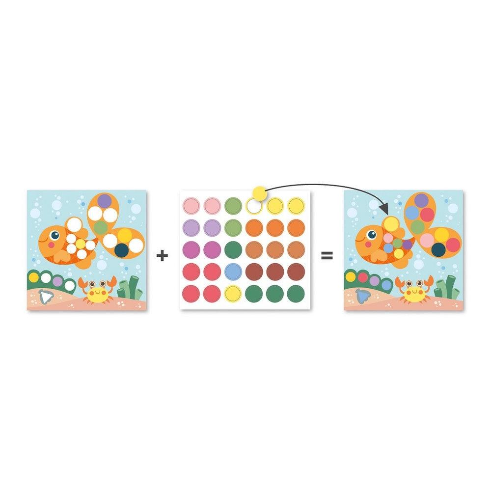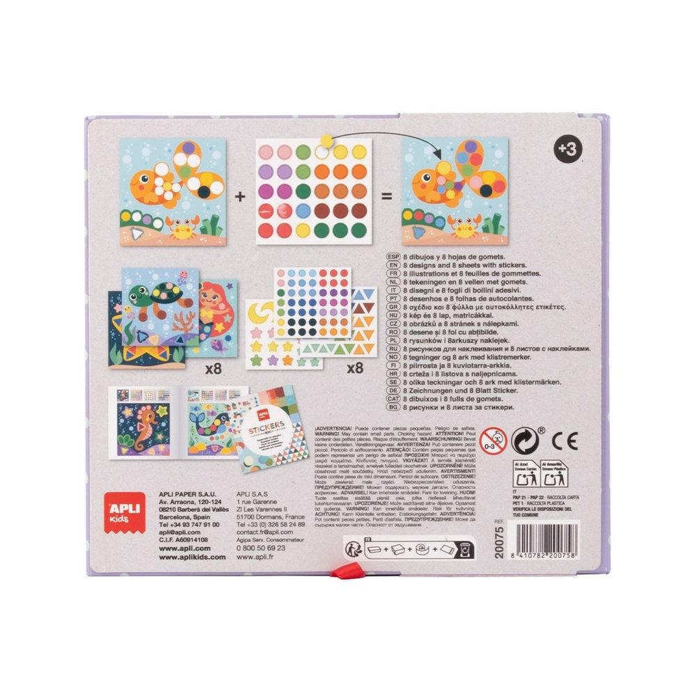 APLI 20075 Juego de gomets geométricos Océano, un set educativo diseñado para que los más pequeños completen dibujos utilizando gomets de diferentes formas y tamaños. Incluye 8 láminas ilustradas, 8 hojas de gomets removibles y 1 librito de ejemplos. Los gomets removibles permiten corregir errores fácilmente, favoreciendo el aprendizaje autónomo. Desarrollado con el apoyo de pedagogos, este juego estimula la psicomotricidad fina, el pensamiento matemático, la concentración, la coordinación óculo-manual y la orientación espacial. Recomendado para niños a partir de 3 años. Medidas del producto: 190 x 40 x 170 mm.