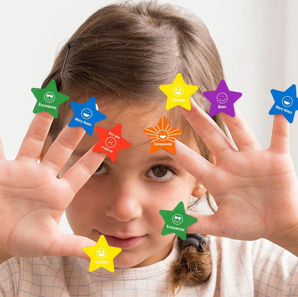 Cada bolsa contiene 6 estilos de estrellas con frases motivacionales y colores distintos: verde (Excelente), amarillo (Genial), naranja (Estupendo), azul (Muy bien), morado (Bien), rojo (Hay que mejorar). Cada hoja contiene 4 estrellas de cada color/frase.
