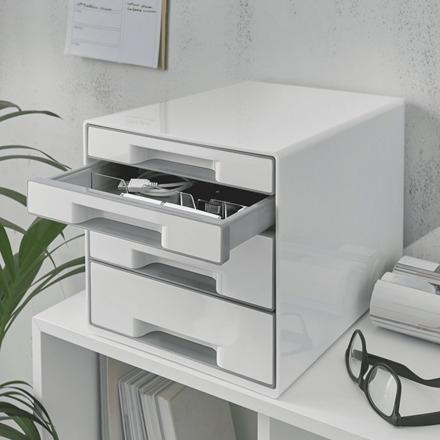 Atractivo buc de cajones WOW CUBE de máxima calidad en vistosa y elegante combinación de dos colores con acabado brillante. Este robusto cubo combina a la perfección con otros productos de la gama WOW de Leitz.