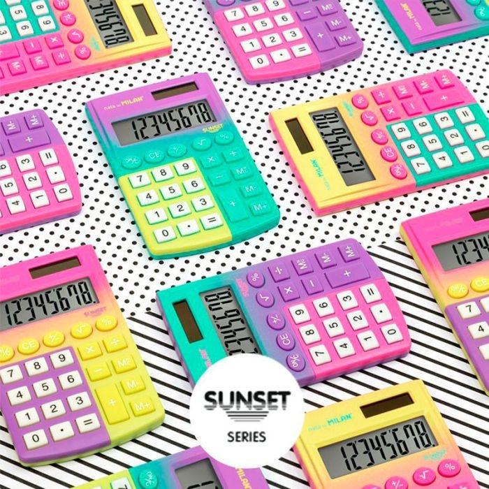 Calculadora de bolsillo de 8 dígitos serie Sunset. Teclas con tacto suave. 3 teclas de memoria y raíz cuadrada. Alimentación dual: célula solar y pila de 1,5 V.
