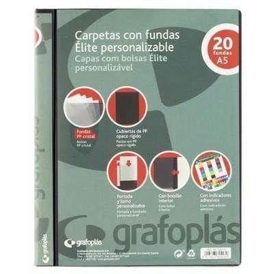 Carpeta Elite Grafoplás con 20 fundas personalizables, fabricada en polipropileno (PP), tamaño A5 y color negro. Ideal para organizar documentos pequeños, presentaciones compactas y uso escolar o profesional. Referencia 98142010.