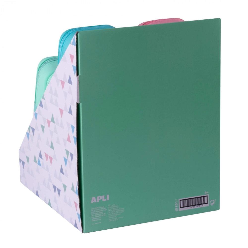 Expositor APLI 19151 con 8 estuches multiusos de silicona de la Nordik Collection, en formato plano rectangular y con acabado de tacto suave. Fabricados en silicona de alta calidad, son flexibles, moldeables, resistentes al agua y muy fáciles de limpiar. Cada estuche incluye doble cremallera y mide 225 × 45 × 105 mm. Disponible en 4 colores surtidos: rosa, violeta, azul y verde. Ideales como estuches escolares, neceseres, portaobjetos o accesorios de uso diario.