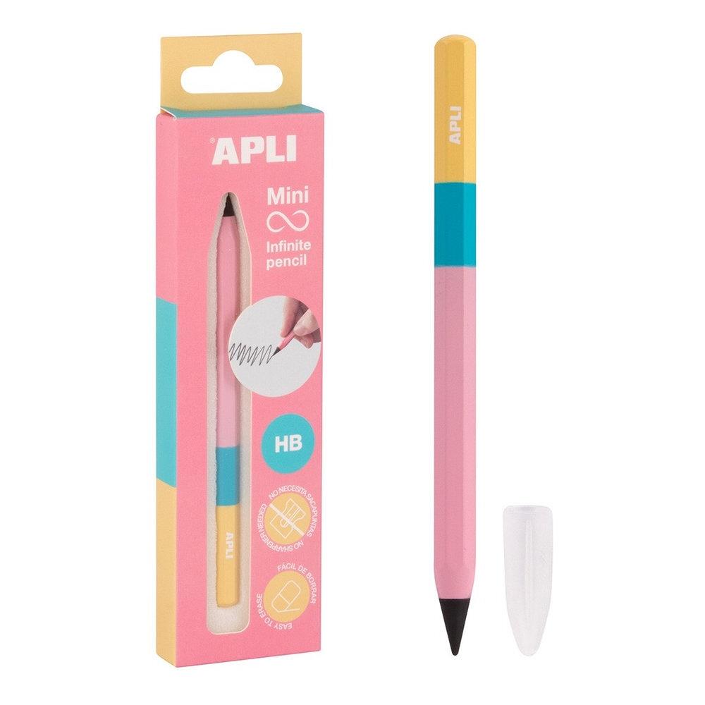 El expositor incluye 20 packs de lápices en 4 modelos con tres colores distintos: tricolor azul turquesa, amarillo y gris; tricolor rosa, azul y amarillo; tricolor lila, rosa y azul turquesa; y tricolor naranja oscuro, lila y naranja claro. Colores pastel para inspirar creatividad y alegría en cada trazo. Cada pack dispone de 1 lápiz Infinito, 1 mina de recambio HB y 1 tapón translúcido de protección.