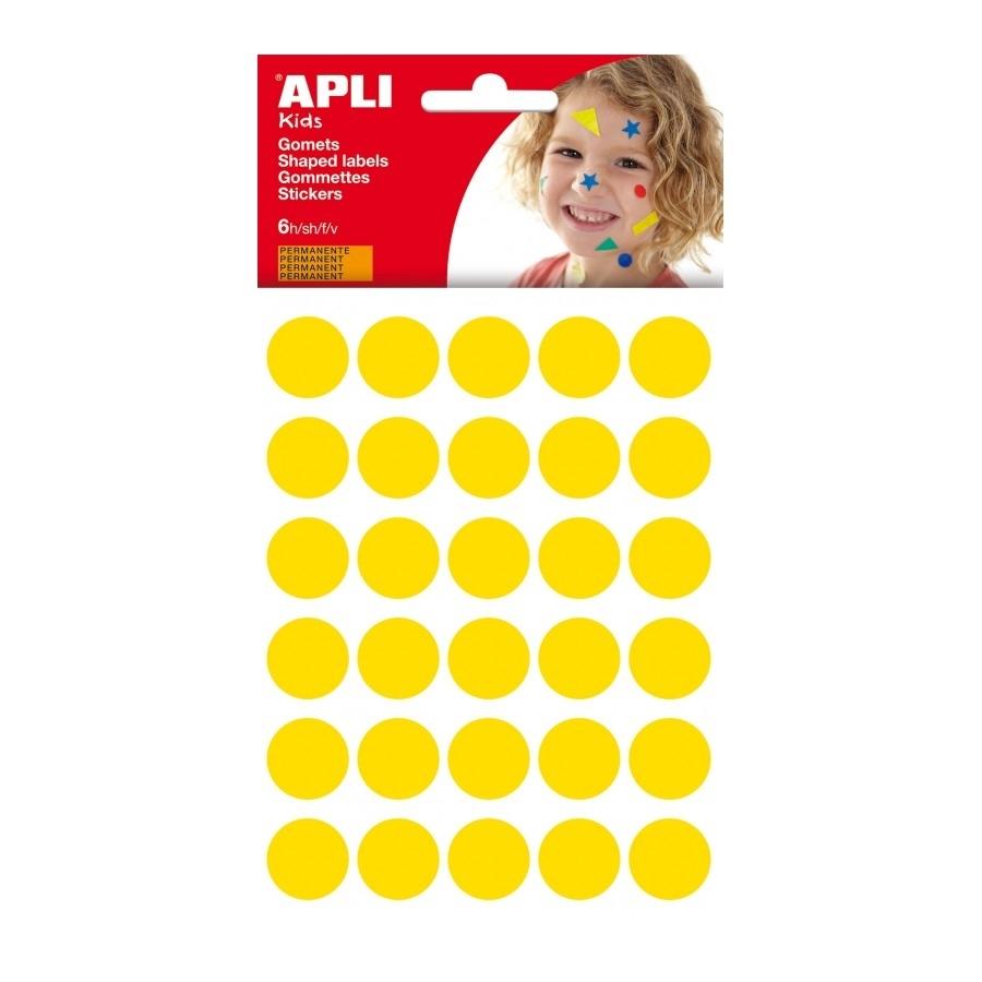 Bolsa de gomets redondos de tamaño Ø 20 mm en color amarillo con adhesivo permanente. Cada bolsa contiene 6 hojas, un total de 180 gomets. Un producto indispensable en cualquier hogar y escuela. Antes de aprender a manejar el lápiz o las pinturas, con estos gomets, los niños pueden ir iniciándose en el mundo de los colores y las formas. Jugar y crear con gomets es una actividad básica que permite desarrollar la psicomotricidad fina y trabajar, al mismo tiempo, varias capacidades y habilidades como el conocimiento de los colores, las formas geométricas y los tamaños; el desarrollo de la lógica y la creatividad; el trabajo en equipo o el dominio del espacio, entre otros. Además, los gomets APLI cumplen con las más estrictas normas de calidad y seguridad: - Se fabrican conforme a las normas EN-71 y a la cadena de custodia FSC - Adhesivo base agua - Libre de disolventes - Papeles ECF (Elemental Chlorine Free) - Materiales 100% reciclables