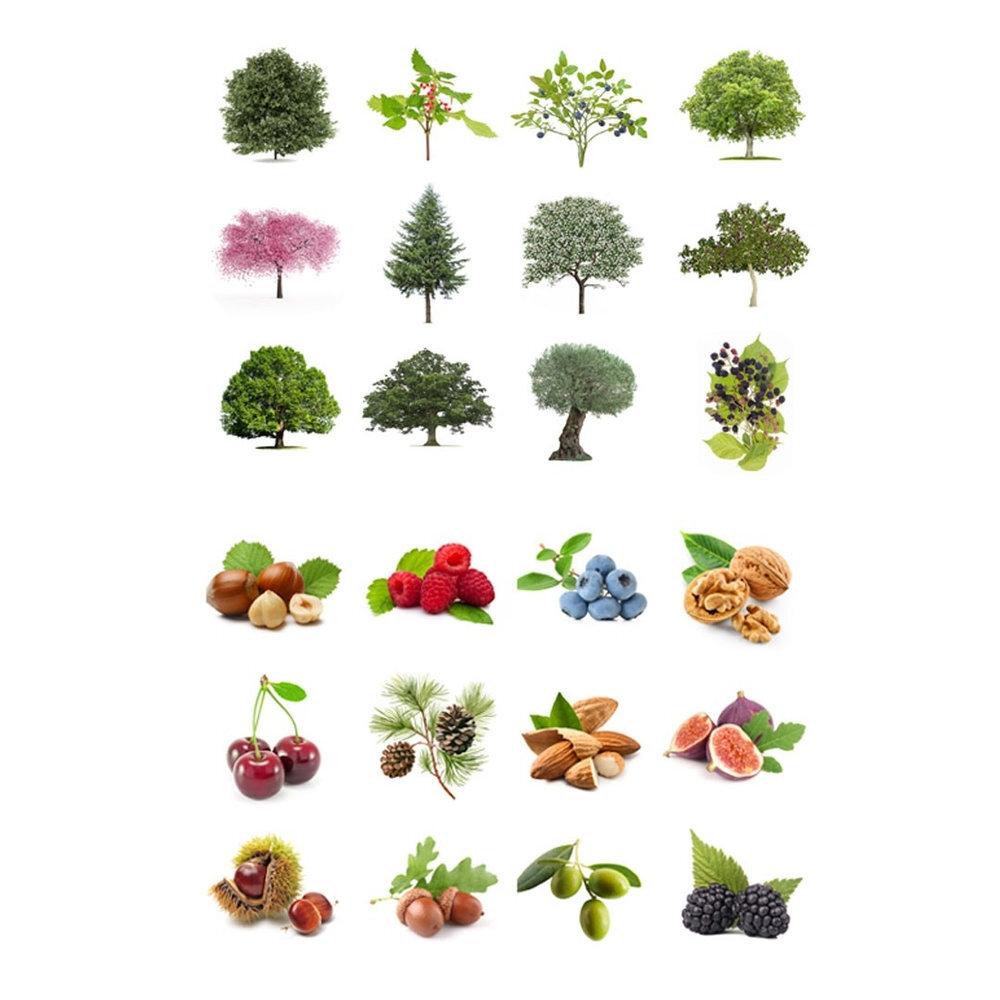 Rollo de gomets con temática árboles y sus frutos de tamaño 33 mm en formas surtidas y adhesivo permanente. Cada rollo contiene 30 hojas pretroqueladas para una fácil separación, con un total de 360 gomets en distintas formas: avellano, nogal, almendro, castaño, roble, higuera, cerezo, arándano, frambueso, abeto, olivo, morera, avellanas, nueces, almendras, castañas, bellotas, higos, cerezas, arándanos, frambuesas, piñas, olivas y moras. Además, incluye un folleto con la correspondencia entre árboles y frutos para poder identificar los gomets.