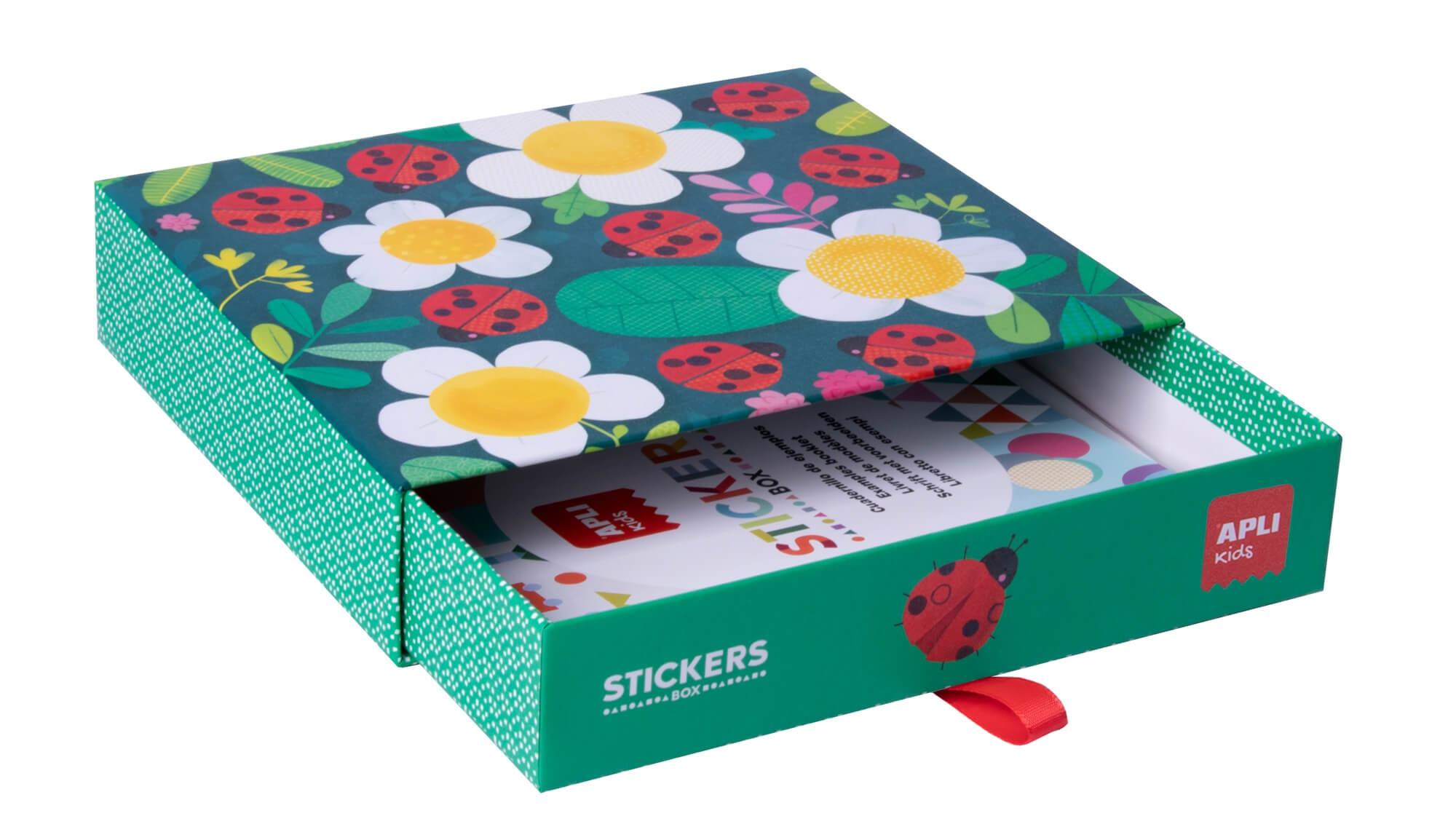 Juegos de gomets modelo Mariquita en caja de cartón. El objetivo del juego es completar los dibujos de las fichas usando gomets de diferentes formas y colores. El juego incluye: 8 láminas ilustradas de 200g con acabado mate para rellenar con gomets, 8 hojas de gomets removibles geométricos en distintos colores y un libro guía con ejemplos en color. Los gomets removibles del juego permiten al niño corregir si se equivoca. Este juego, desarrollado con el soporte de pedagogos, contiene un alto valor didáctico: estimula la psicomotricidad fina, desarrolla el pensamiento matemático, ayuda en la concentración, trabaja el desarrollo óculo-manual y favorece la orientación espacial. Producto con una original presentación y un atractivo diseño: caja de cartón con diseño exclusivo APLI Kids. Juego diseñado para los más pequeños de la familia.