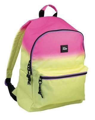 Mochila escolar con 2 cremalleras. Serie especial Sunset, color amarillo-rosa. Forro interior de color lila. Un bolsillo principal con compartimento interior protector para portátil. Bolsillo delantero y dos bolsillos laterales de fácil acceso con velcro. Asas regulables y parte posterior acolchada.