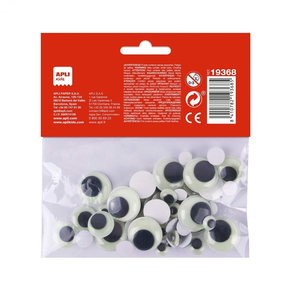 Bolsa APLI 19368 con 50 ojos móviles adhesivos redondos que brillan en la oscuridad, en medidas surtidas: 10 unidades de Ø 20 mm, 10 unidades de Ø 15 mm, 15 unidades de Ø 10 mm y 15 unidades de Ø 8 mm. Ideales para manualidades infantiles, proyectos escolares y talleres creativos. Su efecto luminoso aporta un toque divertido y original a cualquier creación, estimulando la imaginación, la creatividad y la motricidad fina de los niños.