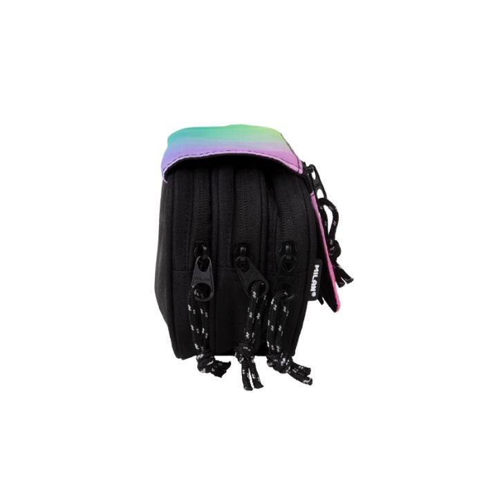 Estuche portatodo de gran capacidad con 3 bolsillos con cremallera y un pequeño bolsillo frontal en la solapa. Cierre de botón a presión. Serie Sunset, color negro. Una combinación de colores degradados inspirados en el atardecer, acompañados de detalles en blanco y negro. Tiradores de las cremalleras con cuerda. Tejido exterior 'ripstop': ligero y resistente a la rotura y rasgaduras. Utiliza una técnica especial que teje hilos gruesos de refuerzo a intervalos regulares en un patrón entrecruzado.