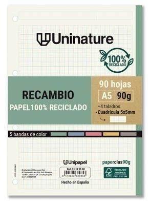 Recambio de papel UniNature Grafoplás, referencia 53393500 y EAN 8413623339853. Incluye 90 hojas en formato A5, fabricadas en papel de 90 g, que ofrece una escritura suave, resistente y sin traspaso. Presenta cuadrícula 5×5 mm sin margen, ideal para apuntes, cálculos, esquemas y uso académico o profesional. Los taladros universales permiten archivar fácilmente las hojas en carpetas y archivadores. La gama UniNature destaca por su compromiso con materiales más sostenibles, ofreciendo un producto práctico, duradero y respetuoso con el entorno.