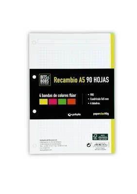 Recambio de papel Bits&Bobs, referencia 53393200 y EAN 8413623339808. Incluye 100 hojas en formato A5, fabricadas en papel de 90 g para una escritura suave y sin traspaso. Presenta cuadrícula 5×5 mm sin margen, ideal para apuntes, esquemas, cálculos y uso académico o profesional. Los taladros universales permiten archivar fácilmente las hojas en carpetas y archivadores. Un recambio práctico, resistente y perfecto para el día a día en oficinas, estudios y centros educativos.