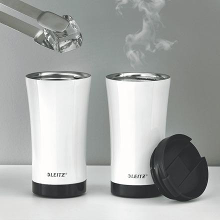 La taza con aislamiento de doble pared de acero inoxidable mantiene sus bebidas calientes y frías durante horas. Exterior blanco con elementos de color WOW para un diseño atractivo.