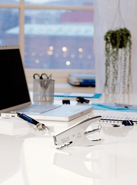 Grapadora de tenaza ergonómica construida totalmente en acero, con tratamiento de pintura en polvo pulverizada. Práctica para uso doméstico, escolar y de oficina, donde solo se necesiten grapas pequeñas.